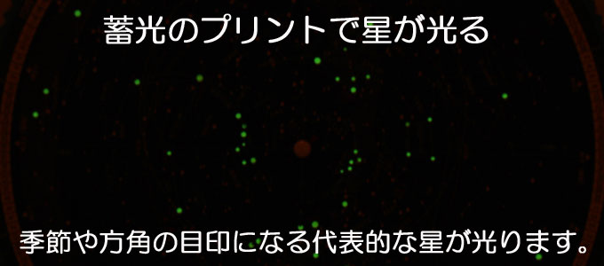 季節や時刻によって夜空の星の位置は刻々と変化します。 この星座早見盤では、一等星および季節を代表する明るい星々(夏の大三角、冬の大三角など)は蓄光インクによって印刷されているので、暗いところで光って見えます。 暗闇での目印となり、星座探しに役立ちます。