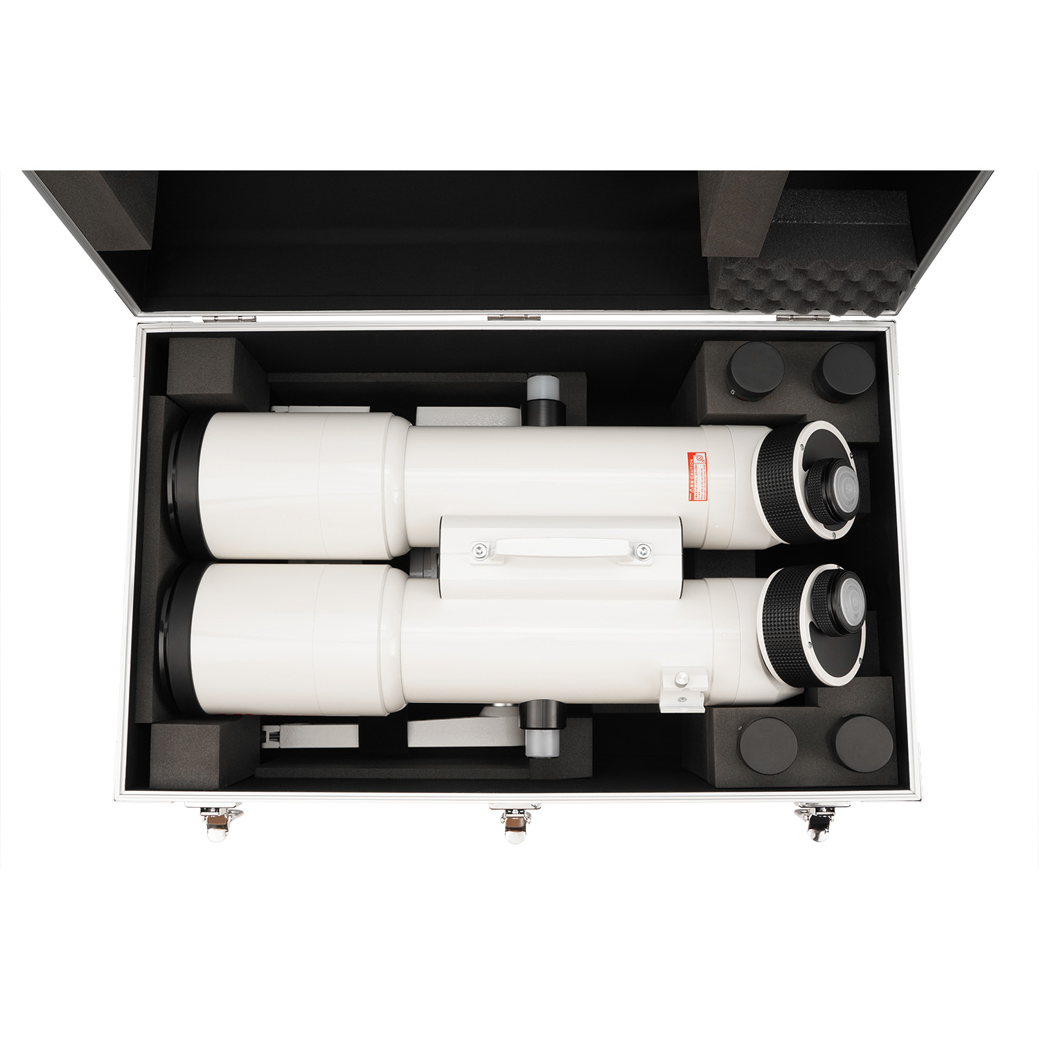 双眼鏡本体、HF2経緯台、ファインダー、接眼レンズ。これまで別々に持ち運ぶ必要があった機材一式を、このケース一つにまとめて収納できます。