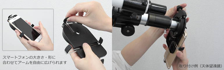 天体望遠鏡や顕微鏡などにスマートフォンを装着して写真撮影ができる「スマートフォン用カメラアダプター」が付属しています。