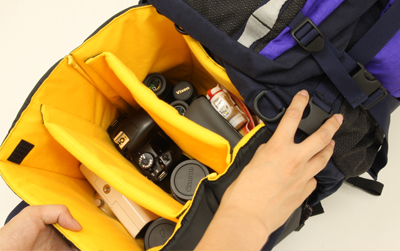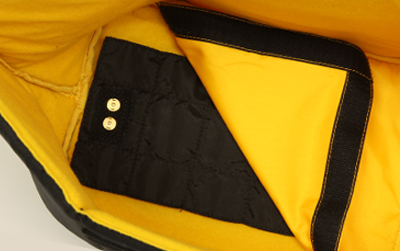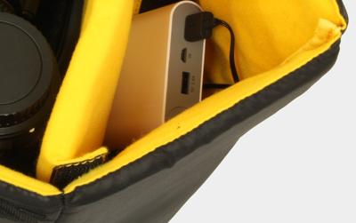 夜の撮影など暗い環境でもカメラの黒いアクセサリーを探しやすいようにバッグの内側に明るい黄色の生地を採用しています。